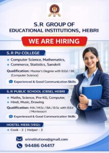 ಹೆಬ್ರಿ:ಹೆಬ್ರಿಯಲ್ಲಿರುವ ಎಸ್.ಆರ್. ಗ್ರೂಪ್ ಆಫ್ ಎಜುಕೇಶನಲ್ ಇನ್ಸ್ಟಿಟ್ಯೂಷನ್ಸ್ನಲ್ಲಿ ವಿವಿಧ ಶಿಕ್ಷಕ ಹಾಗೂ ಸಿಬ್ಬಂದಿ ಹುದ್ದೆಗಳಿಗೆ ನೇಮಕಾತಿ ನಡೆಯಲಿದೆ. ಎಸ್.ಆರ್. ಪಿಯು ಕಾಲೇಜು:▪️ಕಂಪ್ಯೂಟರ್ ಸೈನ್ಸ್, ಗಣಿತ, ▪️ಕಾಮರ್ಸ್, ಸ್ಟಾಟಿಸ್ಟಿಕ್ಸ್, ಸಂಸ್ಕೃತ ವಿಷಯಗಳಿಗೆ ಶಿಕ್ಷಕರ ಅಗತ್ಯವಿದೆ. ಅರ್ಹತೆ: