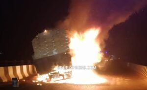 ಉಡುಪಿ: ಟಯರ್ ಸ್ಫೋಟಗೊಂಡು ಲಾರಿಯೊಂದು ಸೇತುವೆ ಮೇಲೆ ಹೊತ್ತಿ ಉರಿದ ಘಟನೆ ಗುರುವಾರ ಮಧ್ಯರಾತ್ರಿ ಬೈಂದೂರಿನ ಉಪ್ಪುಂದ-ಬಿಜೂರು ರಾಷ್ಟ್ರೀಯ ಹೆದ್ದಾರಿ-66ರಲ್ಲಿ ಸಂಭವಿಸಿದೆ. ಧಾರವಾಡದಿಂದ ಕುಂದಾಪುರಕ್ಕೆ ಪಶು ಆಹಾರವನ್ನು ಸಾಗಿಸುತ್ತಿದ್ದ ಲಾರಿಯು ರಾತ್ರಿ 1ಗಂಟೆ ಸುಮಾರಿಗೆ