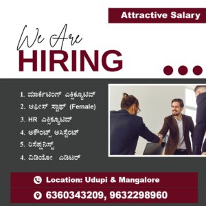 ಉಡುಪಿ:ಉಡುಪಿ ಹಾಗೂ ಮಂಗಳೂರಿನಲ್ಲಿ ವಿವಿಧ ಹುದ್ದೆಗಳಿಗೆ ನೇಮಕಾತಿ ನಡೆಯಲಿದೆ. ಲಭ್ಯವಿರುವ ಹುದ್ದೆಗಳು: 🔹ಮಾರ್ಕೆಟಿಂಗ್ ಎಕ್ಸಿಕ್ಯೂಟಿವ್ 🔹ಆಫೀಸ್ ಸ್ಟಾಫ್ (ಮಹಿಳೆ) 🔹HR ಎಕ್ಸಿಕ್ಯೂಟಿವ್ 🔹ಅಕೌಂಟ್ಸ್ ಅಸಿಸ್ಟೆಂಟ್ 🔹ರಿಸೆಪ್ಷನಿಸ್ಟ್ 🔹ವಿಡಿಯೋ ಎಡಿಟರ್ ಮಾಹಿತಿಗಾಗಿ ಸಂಪರ್ಕಿಸಿ :📞 6360343209,