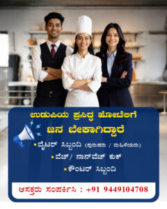 ಉಡುಪಿ:ಉಡುಪಿಯ ಪ್ರತಿಷ್ಠಿತ ಹೋಟೆಲ್ನಲ್ಲಿ ವೈಟರ್ (ಪುರುಷರು/ಮಹಿಳೆಯರು) ವೆಜ್/ನಾನ್ ವೆಜ್ ಕುಕ್, ಹಾಗೂ ಕೌಂಟರ್ ಸಿಬ್ಬಂದಿ ಹುದ್ದೆಗಳಿಗೆ ನೇಮಕಾತಿ ನಡೆಯಲಿದೆ. ಆಸಕ್ತರು ಸಂಪರ್ಕಿಸಿ.📞 +91 94491 04708