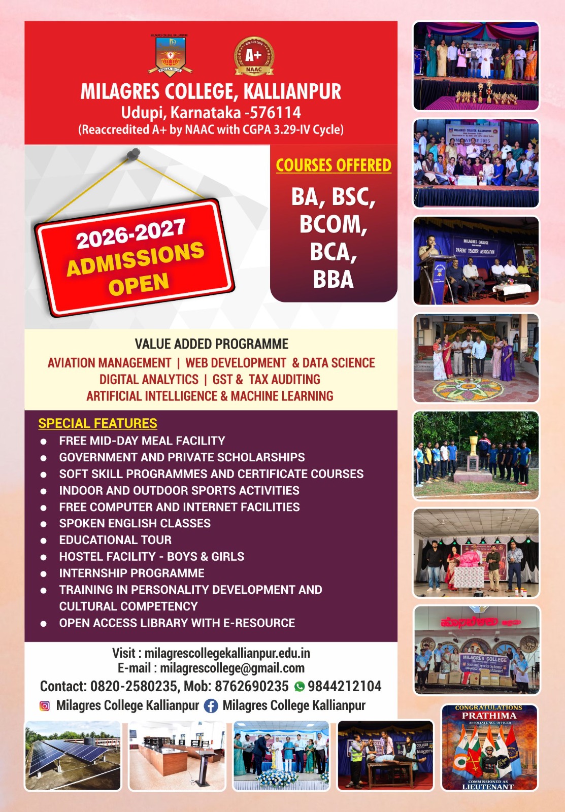 ಉಡುಪಿ:ಕಲ್ಯಾಣಪುರ ಮಿಲಾಗ್ರೆಸ್ ಕಾಲೇಜು 2026-27 ಶೈಕ್ಷಣಿಕ ಸಾಲಿನ ವಿದ್ಯಾರ್ಥಿ ಪ್ರವೇಶ ಪ್ರಕ್ರಿಯೆ ಆರಂಭಗೊಂಡಿದೆ. COURSES OFFERED BA,BSC BCOM, BCA, BBAಈ ಸಂಸ್ಥೆ ಉತ್ತಮ ಗುಣಮಟ್ಟ ಶಿಕ್ಷಣಕ್ಕಾಗಿ ಪ್ರಸಿದ್ಧಿಯಾಗಿದೆ.