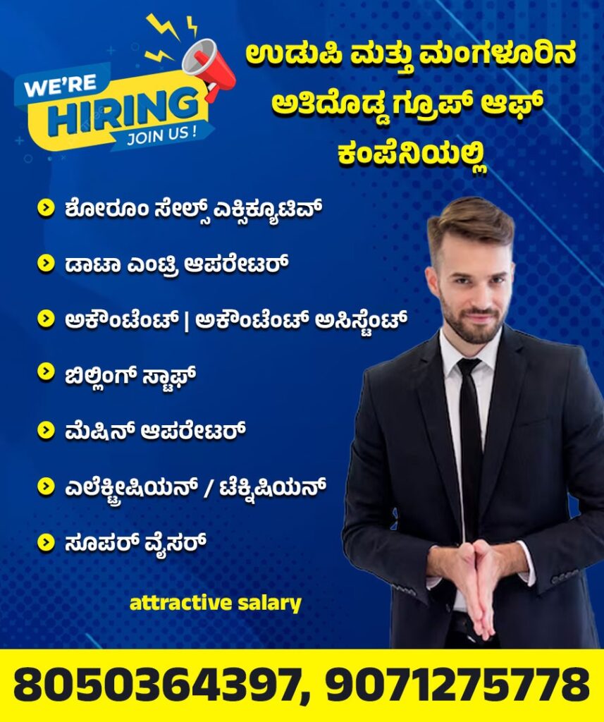 ಉಡುಪಿ ಮತ್ತು ಮಂಗಳೂರಿನ ಪ್ರಖ್ಯಾತ ಗ್ರೂಪ್ ಆಫ್ ಕಂಪೆನಿಯಲ್ಲಿ ಉದ್ಯೋಗವಕಾಶ!