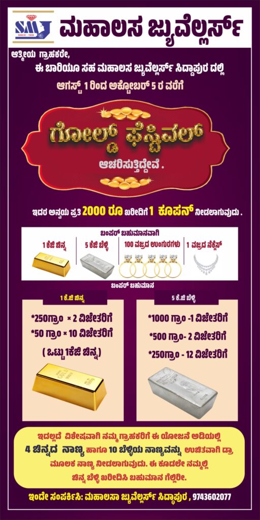 ಉಡುಪಿ:ರಾಜ್ಯ ಜುವೆಲರ್ಸ್ ಫೆಡರೇಶನ್ ಆ.1ರಿಂದ ಅ.5ರವರೆಗೆ ರಾಜ್ಯಾದ್ಯಂತ ಗೋಲ್ಡ್ ಫೆಸ್ಟಿವಲ್ ಆಯೋಜಿಸಿದ್ದು, ಈ ಬಗ್ಗೆ ಪೂರ್ವಭಾವಿ ಸಭೆ ಕಲ್ಲಂಕ ಬಳಿಯ ಓಶನ್ ಪರ್ಲ್ ಸಭಾಂಗಣದಲ್ಲಿ ಇತ್ತೀಚೆಗೆ ನಡೆಯಿತು. ಈ ಅವಧಿಯಲ್ಲಿ ಭಾಗವಹಿಸುವ ಎಲ್ಲ ಜುವೆಲರಿಗಳಲ್ಲಿ ಚಿನ್ನ ಬೆಳ್ಳಿ ಖರೀದಿಸುವ ಗ್ರಾಹಕರಿಗೆ ಕೂಪನ್ಗಳನ್ನು ನೀಡಲಾಗುತ್ತಿದೆ. ಅವುಗಳಿಗೆ 1 ಕೆಜಿ ಚಿನ್ನ 5 ಕೆಜಿ ಬೆಳ್ಳಿಯ ಬಂಪರ್ ಬಹುಮಾನ, 100 ವಜ್ರದ ಉಂಗುರ, 1 ವಜ್ರದ ನೆಕ್ಲಸ್ ಹಾಗೂ ಇನ್ನೂ ಹಲವು ಚಿನ್ನ ಬೆಳ್ಳಿಯ ಬಹುಮಾನಗಳು ಸೇರಿ ಸುಮಾರು 2 […]