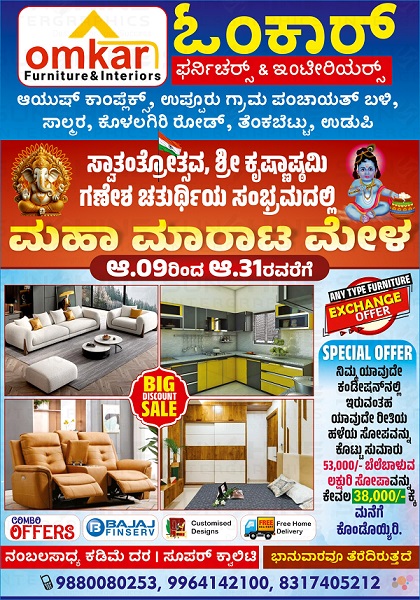 ಉಡುಪಿಯ ಓಂಕಾರ್ ಫರ್ನಿಚರ್ & ಇಂಟೀರಿಯರ್ಸ್ ನಲ್ಲಿ ಮಹಾ ಮರಾಟ ಮೇಳ: ಪಡೆಯಿರಿ ಭರ್ಜರಿ ರಿಯಾಯಿತಿ.