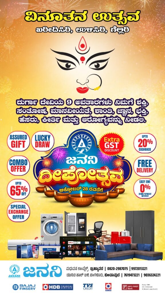 ಉಡುಪಿ: ಬ್ರಹ್ಮಾವರ ಹಾಗೂ ಕುಂದಾಪುರದಲ್ಲಿ ಅ. 28 ರವರೆಗೆ ಜನನಿ ದೀಪೋತ್ಸವ ನಡೆಯಲಿದೆ. ವಿಶೇಷತೆಗಳು:🔹ಖಚಿತ ಉಡುಗೊರೆ🔹ಕಾಂಬೊ ಆಫರ್🔹65% ವರೆಗೆ ರಿಯಾಯಿತಿ🔹ಲಕ್ಕಿ ಡ್ರಾ🔹ಹೆಚ್ಚುವರಿ GST ರಿಯಾಯಿತಿ🔹20% ವರೆಗೆ ಕ್ಯಾಶ್ಬ್ಯಾಕ್🔹ಉಚಿತ ಡೆಲಿವರಿ🔹ಸುಲಭ EMI 0% ಡೌನ್ ಪೇಮೆಂಟ್ ಬಡ್ಡಿ🔹ವಿಶೇಷ ವಿನಿಮಯ ಕೊಡುಗೆ 75 ಲಕ್ಕಿ ಡ್ರಾ: ರೂ.50,000 – ಗಿಫ್ಟ್ ವೋಚರ್ -1ರೂ.10,000- ಗಿಫ್ಟ್ ವೋಚರ್-5ರೂ.2,000- ಗಿಫ್ಟ್ ವೋಚರ್-69 ಡ್ರಾ ಆಗುವ ದಿನಾಂಕ 1/11/2025. ಹೆಚ್ಚಿನ ಮಾಹಿತಿಗಾಗಿ ಸಂಪರ್ಕಿಸಿ:ಮಧುವನ ಕಾಂಪ್ಲೆಕ್ಸ್ ಬ್ರಹ್ಮಾವರ| 0820-2987075 | 9972013221 ಯುನಿಟಿ ಹಾಲ್ ಬಳಿ, […]