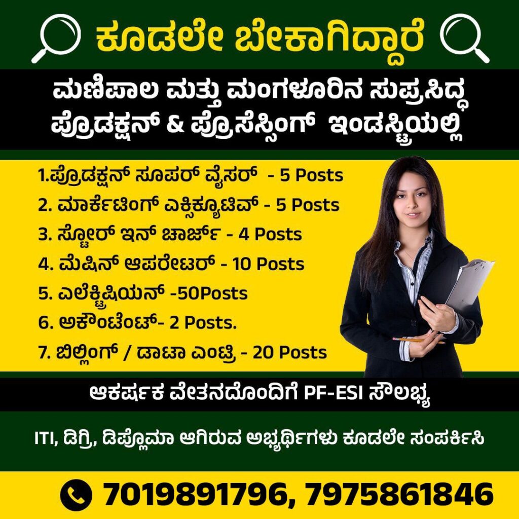 ಉಡುಪಿ:ಮಣಿಪಾಲ ಮತ್ತು ಮಂಗಳೂರಿನ ಸುಪ್ರಸಿದ್ಧ ಪ್ರೊಡಕ್ಷನ್ & ಪ್ರೊಸೆಸ್ಸಿಂಗ್ ಇಂಡಸ್ಟ್ರಿಯಲ್ಲಿ ವಿವಿಧ ಹುದ್ದೆಗಳಿಗೆ ನೇಮಕಾತಿ ನಡೆಯಲಿದೆ. ಹುದ್ದೆಗಳು: ◾ಪ್ರೊಡಕ್ಷನ್ ಸೂಪರ್ ವೈಸರ್ – 5 Posts◾ಮಾರ್ಕೆಟಿಂಗ್ ಎಕ್ಸಿಕ್ಯೂಟಿವ್ – 5 Posts◾ಸ್ಟೋರ್ ಇನ್ ಚಾರ್ಜ್ – 4 Posts◾ಮೆಷಿನ್ ಆಪರೇಟರ್ – 10 Posts –◾ಎಲೆಕ್ಟ್ರೀಷಿಯನ್ -50Posts◾ಅಕೌಂಟೆಂಟ್ – 2 Posts.◾ಬಿಲ್ಲಿಂಗ್ / ಡಾಟಾ ಎಂಟ್ರಿ – 20 Posts ಆಕರ್ಷಕ ವೇತನದೊಂದಿಗೆ PF-ESI ಸೌಲಭ್ಯವಿದೆ. ITI, ಡಿಗ್ರಿ, ಡಿಪ್ಲೊಮಾ ಆಗಿರುವ ಅಭ್ಯರ್ಥಿಗಳು ಕೂಡಲೇ ಸಂಪರ್ಕಿಸಿ.📞7019891796,📞 7975861846