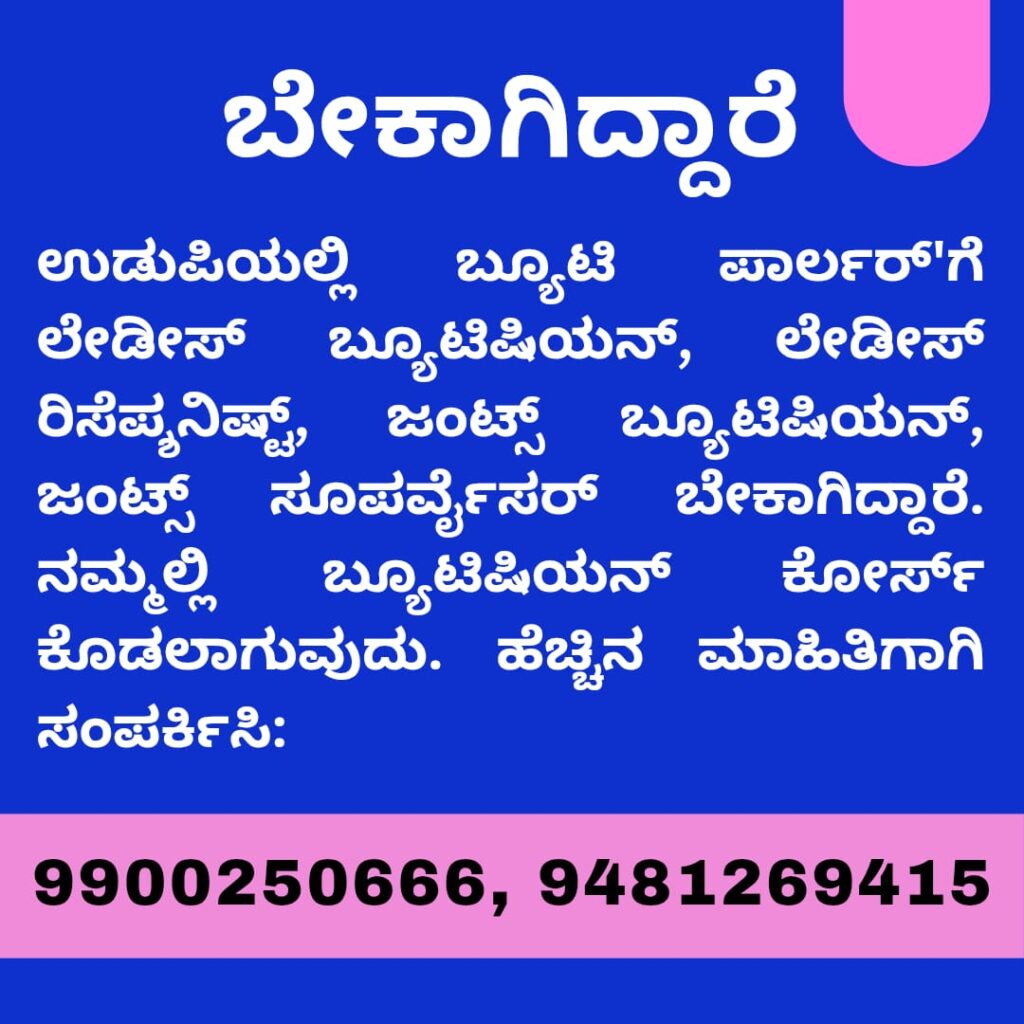 ಉಡುಪಿ: ಉಡುಪಿಯಲ್ಲಿ ಇರುವ ಬ್ಯೂಟಿ ಪಾರ್ಲರ್’ಗೆ ಲೇಡೀಸ್ ಬ್ಯೂಟಿಷಿಯನ್, ಲೇಡೀಸ್ ರಿಸೆಪ್ಶನಿಷ್ಟ್, ಜಂಟ್ಸ್ ಬ್ಯೂಟಿಷಿಯನ್ ಹಾಗೂ ಜಂಟ್ಸ್ ಸೂಪರ್ವೈಸರ್ ಬೇಕಾಗಿದ್ದಾರೆ. ನಮ್ಮಲ್ಲಿ ಬ್ಯೂಟಿಷಿಯನ್ ಕೋರ್ಸ್ ಕೊಡಲಾಗುವುದು. ಹೆಚ್ಚಿನ ಮಾಹಿತಿಗಾಗಿ ಸಂಪರ್ಕಿಸಿ: ಮೊ: 9900250666, 9481269415