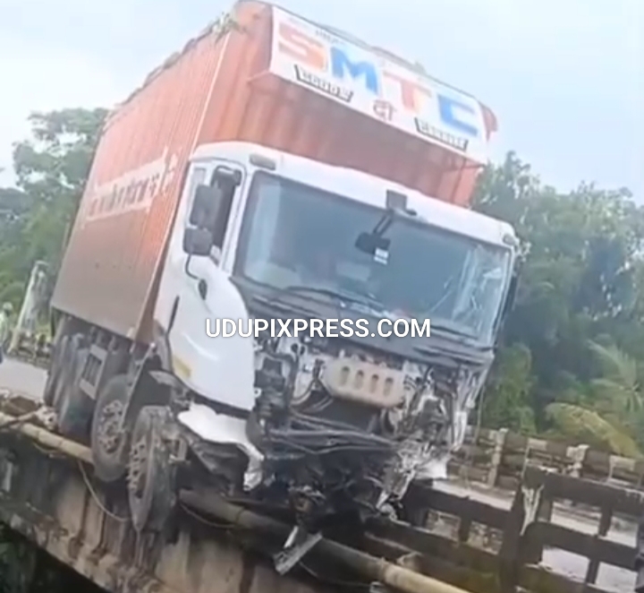 ಖಂಬದಕೋಣೆ; ಸೇತುವೆಗೆ ಡಿಕ್ಕಿ ಹೊಡೆದ ಕಂಟೈನರ್; ತಪ್ಪಿದ ಬಾರಿ ಅನಾಹುತ