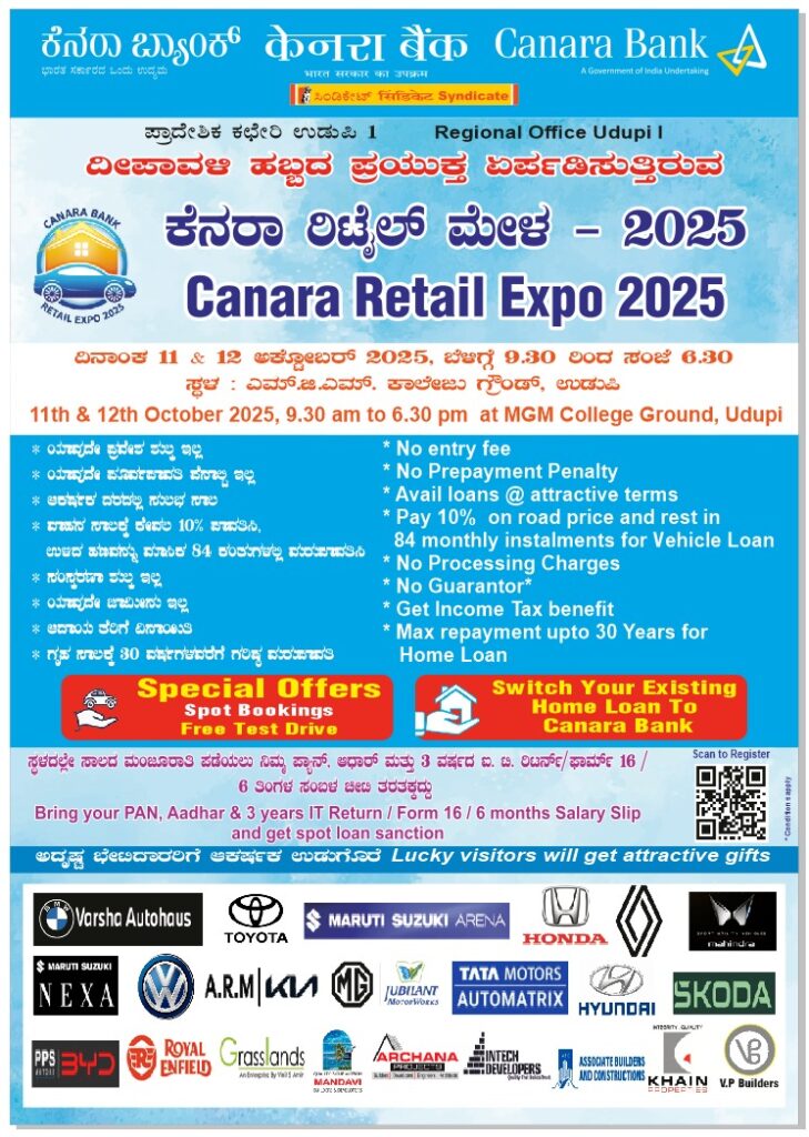 ಅ.11,12 ರಂದು ಉಡುಪಿಯಲ್ಲಿ ಕೆನರಾ ರಿಟೈಲ್ ಮೇಳ: ದೀಪಾವಳಿಗೆ ಕೆನರಾ ಬ್ಯಾಂಕ್ ನೀಡ್ತಿದೆ ಈ ಭರ್ಜರಿ ಆಫರ್