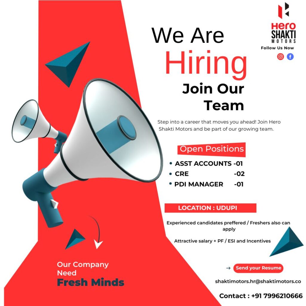 ಉಡುಪಿಯ ಹೀರೋ ಶಕ್ತಿ ಮೋಟರ್ಸ್ ನಲ್ಲಿ ವಿವಿಧ ಹುದ್ದೆಗಳಿಗೆ ನೇಮಕಾತಿ