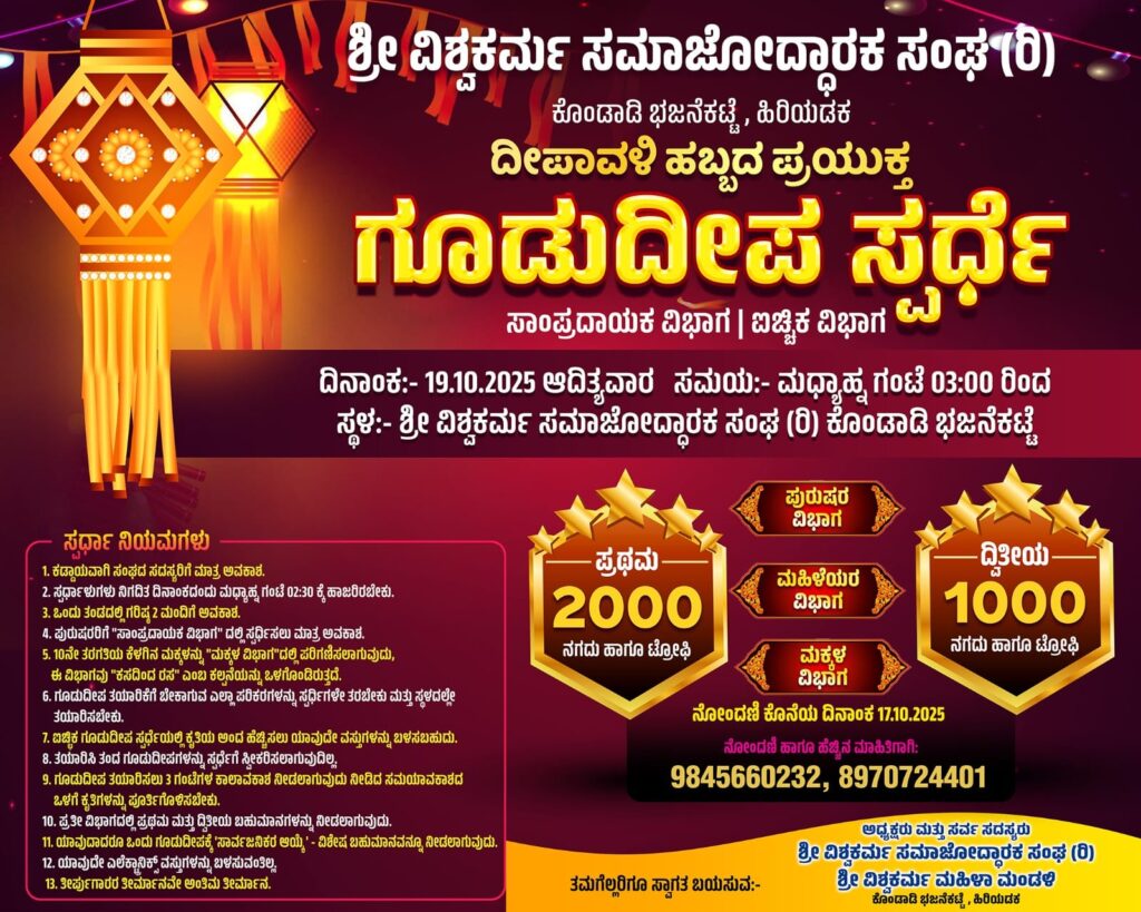 ಹಿರಿಯಡಕ: ವಿಶ್ವಕರ್ಮ ಸಮಾಜೋದ್ಧಾರಕ ಸಂಘ (ರಿ.) ಕೊಂಡಾಡಿ: ಅ.19 ರಂದು ದೀಪಾವಳಿ ಹಬ್ಬದ ಪ್ರಯುಕ್ತ ಗೂಡುದೀಪ ಸ್ಪರ್ಧೆ