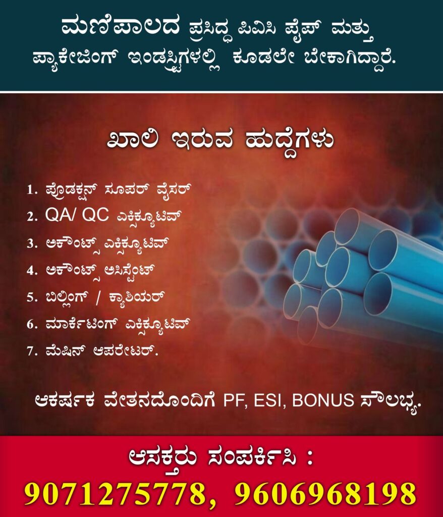 ಮಣಿಪಾಲದ ಪ್ರಸಿದ್ಧ ಪಿವಿಸಿ ಮತ್ತು ಪ್ಯಾಕೇಜಿಂಗ್ ಇಂಡಸ್ಟ್ರಿಯಲ್ಲಿ ಉದ್ಯೋಗವಕಾಶ!