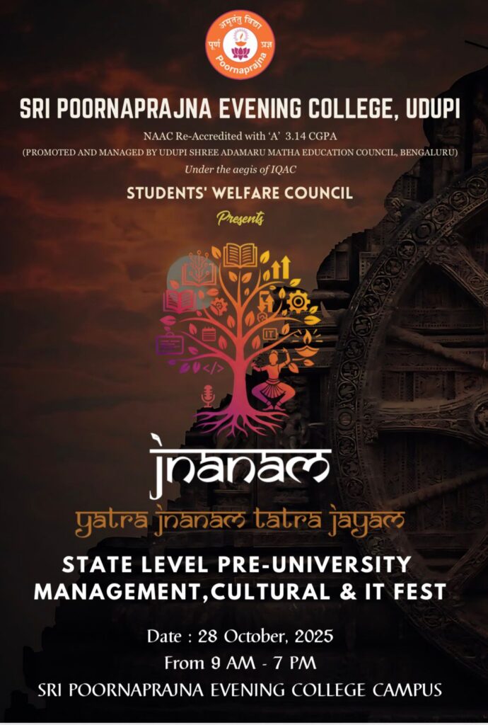 ಉಡುಪಿ: ಶ್ರೀ ಪೂರ್ಣಪ್ರಜ್ಞ ಸಂಧ್ಯಾ ಕಾಲೇಜು, ಉಡುಪಿ ಇದರ ವತಿಯಿಂದ ದಿನಾಂಕ 28-10-2025ನೇ ಮಂಗಳವಾರದಂದು ಉಡುಪಿ, ಮಂಗಳೂರು, ಕಾರ್ಕಳ ಹಾಗೂ ಕುಂದಾಪುರದ ಪದವಿಪೂರ್ವ ವಿದ್ಯಾರ್ಥಿಗಳಿಗಾಗಿ ಜ್ಞಾನಂ – 2025 ಎಂಬ ವಿಭಿನ್ನ ಸ್ಪರ್ಧಾ ಕಾರ್ಯಕ್ರಮ ಒಂದನ್ನು ಆಯೋಜಿಸಲಾಗಿದೆ. ಈ ಕಾರ್ಯಕ್ರಮದ ಪ್ರಯುಕ್ತ ಪದವಿಪೂರ್ವ ವಿದ್ಯಾರ್ಥಿಗಳಿಗಾಗಿ ಸಾಂಸ್ಕೃತಿಕ, ವಾಣಿಜ್ಯ ವಿಭಾಗ, ಮಾಹಿತಿ ತಂತ್ರಜ್ಞಾನ ಹಾಗೂ ಕಲಾ ವಿಭಾಗಗಳಿಗೆ ಸಂಬಂಧಿಸಿದಂತೆ ವಿಶಿಷ್ಟವಾದ ಸ್ಪರ್ಧೆಗಳನ್ನು ಹಮ್ಮಿಕೊಳ್ಳಲಾಗಿದೆ. ಸಂಧ್ಯಾ ಕಾಲೇಜಿನ ವಿದ್ಯಾರ್ಥಿಗಳ ತಂಡವು ಈಗಾಗಲೇ ಜಿಲ್ಲೆಯ ಎಲ್ಲಾ ಪದವಿಪೂರ್ವ ಕಾಲೇಜುಗಳನ್ನು ಸಂಪರ್ಕಿಸಿದ್ದು ಮಾಹಿತಿಯನ್ನು […]