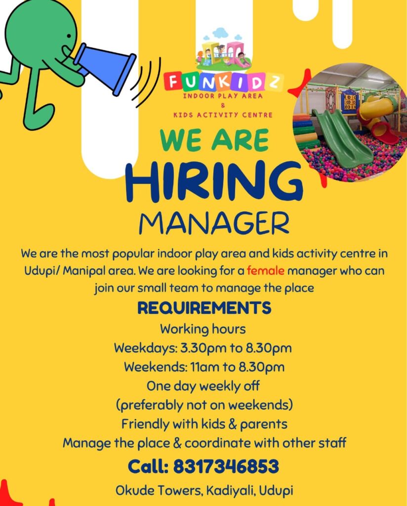 ಉಡುಪಿಯ FUN KIDZ ನಲ್ಲಿ ಮಹಿಳಾ ಮ್ಯಾನೇಜರ್ ಹುದ್ದೆಗೆ ನೇಮಕಾತಿ