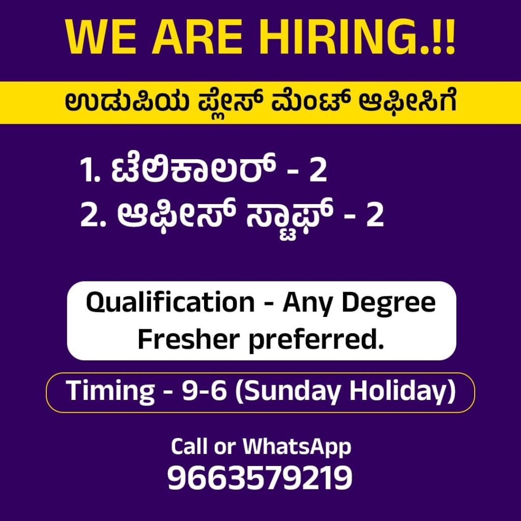 ಉಡುಪಿಯ ಪ್ಲೇಸ್ ಮೆಂಟ್ ಆಫೀಸಿನಲ್ಲಿ ಟೆಲಿಕಾಲರ್ ಮತ್ತು ಆಫೀಸ್ ಸ್ಟಾಫ್ ಹುದ್ದೆಗೆ ಬೇಕಾಗಿದ್ದಾರೆ.