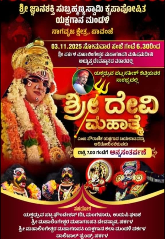 ಪರ್ಕಳ: ಇಂದು (ನ.3) ಪಟ್ಲ ಸತೀಶ್ ಶೆಟ್ಟಿ ಸಾರಥ್ಯದಲ್ಲಿ “ಶ್ರೀ ದೇವಿ ಮಹಾತ್ಮೆ” ಯಕ್ಷಗಾನ ಪ್ರದರ್ಶನ