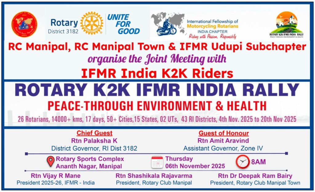 ಮಣಿಪಾಲ: ನಾಳೆ (ನ.6) ವಿಶೇಷ ಜಂಟಿ ಸಭೆ; ರೋಟರಿ k2k IFMR ಇಂಡಿಯಾ ರ್ಯಾಲಿ ತಂಡದ ಸಾಹಸಮಯ ಯಾತ್ರಿಕರು ಭಾಗಿ