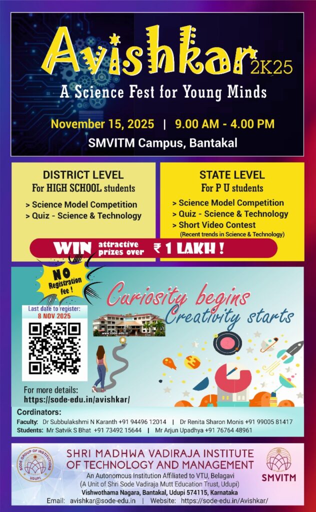 ಉಡುಪಿ, ಬಂಟಕಲ್: ಬಂಟಕಲ್ನಲ್ಲಿರುವ ಶ್ರೀ ಮಧ್ವ ವಾದಿರಾಜತಾಂತ್ರಿಕ ಮಹಾವಿದ್ಯಾಲಯದಲ್ಲಿ ಪದವಿ ಪೂರ್ವ ಮತ್ತು ಫ್ರೌಢಶಾಲಾವಿದ್ಯಾರ್ಥಿಗಳಲ್ಲಿ ವೈಜ್ಞಾನಿಕ ಕುತೂಹಲ ಹಾಗೂ ಹೊಸಆಲೋಚನೆಗಳನ್ನು ಉತ್ತೇಜಿಸಲು ಆವಿಷ್ಕಾರ 2025 ರಾಜ್ಯಮಟ್ಟದ ವಿಜ್ಞಾನ ಮತ್ತು ತಂತ್ರಜ್ಞಾನ ಸ್ಪರ್ಧೆಯನ್ನು ದಿನಾಂಕ 15 ನವೆಂಬರ್ 2025 ರಂದು ಆಯೋಜಿಸಲಾಗಿದೆ. ವಿಜ್ಞಾನದಲ್ಲಿ ಆಸಕ್ತಿ ಬೆಳೆಸುವ, ಸೃಜನಾತ್ಮಕ ಚಿಂತನೆಗೆ ಉತ್ತೇಜನನೀಡುವ ಹಾಗೂ ತಂತ್ರಜ್ಞಾನ ಜ್ಞಾನವನ್ನು ವಿಸ್ತರಿಸುವ ಉದ್ದೇಶದಿಂದಆವಿಷ್ಕಾರ 2025 ಯನ್ನು ಆಯೋಜಿಸಲಾಗಿದೆ. ಉಡುಪಿ ಜಿಲ್ಲಾ ಪಂಚಾಯತ್ನ ಮುಖ್ಯ ಕಾರ್ಯನಿರ್ವಹಣಾಧಿಕಾರಿ ಪ್ರತೀಕ್ ಬಯ್ಯಲ್ ಐ. ಎ. ಎಸ್ ಇವರು ಮುಖ್ಯ […]