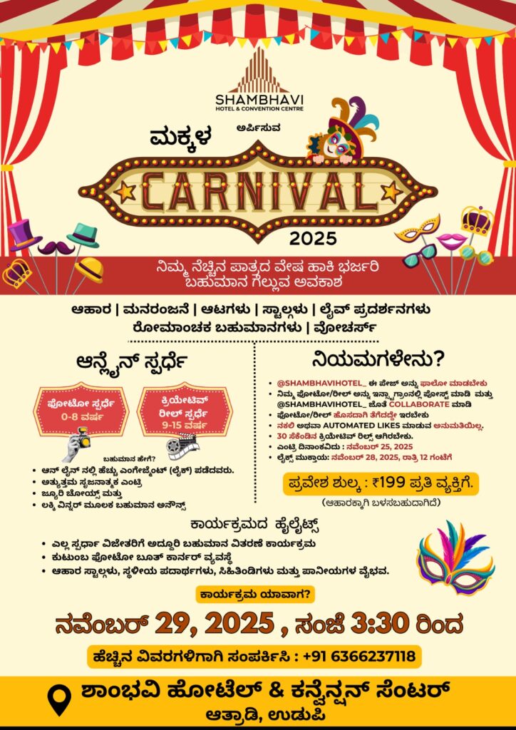 ಉಡುಪಿ: ಮಕ್ಕಳ ದಿನಾಚರಣೆ ಪ್ರಯುಕ್ತ ಉಡುಪಿಯ ಆತ್ರಾಡಿ ಶಾಂಭವಿ ಹೋಟೆಲ್ & ಕನ್ವೆನ್ಷನ್ ಸೆಂಟರ್ ಪ್ರಸ್ತುತಪಡಿಸುತ್ತಿದೆ ಮಕ್ಕಳ ಕಾರ್ನಿವಲ್-2025 ನಿಮ್ಮ ನೆಚ್ಚಿನ ಪಾತ್ರದ ವೇಷ ಹಾಕಿ ಭರ್ಜರಿ ಬಹುಮಾನ ಗೆಲ್ಲುವ ಅವಕಾಶ. ಜೊತೆಗೆ ಈ ಮಕ್ಕಳ ಕಾರ್ನಿವಲ್ ನಲ್ಲಿ ಆಹಾರ | ಮನರಂಜನೆ | ಆಟಗಳು | ಸ್ಟಾಲ್ಗಳು | ಲೈವ್ ಪ್ರದರ್ಶನಗಳು ಮತ್ತು ರೋಮಾಂಚಕ ಬಹುಮಾನಗಳು ವೋಚರ್ಸ್ ಗಳು ನಿಮಗಾಗಿ ಕಾದಿವೆ. ಆನ್ಲೈನ್ ಸ್ಪರ್ಧೆಗಳಿವು:ಫೋಟೋ ಸ್ಪರ್ಧೆ (0–8 ವರ್ಷ)ಕ್ರಿಯೇಟಿವ್ ರೀಲ್ ಸ್ಪರ್ಧೆ (9–15 ವರ್ಷ) ಹೀಗೆ […]