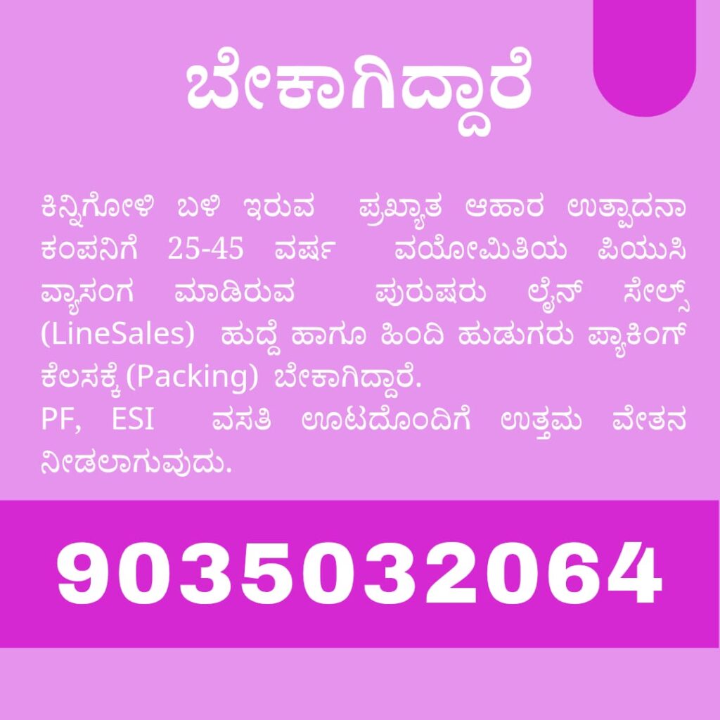 ಕಿನ್ನಿಗೋಳಿ ಬಳಿ ಇರುವ ಪ್ರಖ್ಯಾತ ಆಹಾರ ಉತ್ಪಾದನಾ ಕಂಪನಿಗೆ 25-45 ವರ್ಷ ವಯೋಮಿತಿಯ ಪಿಯುಸಿ ವ್ಯಾಸಂಗ ಮಾಡಿರುವ ಪುರುಷರು ಲೈನ್ ಸೇಲ್ಸ್ ( LineSales) ಹುದ್ದೆ ಹಾಗೂ ಹಿಂದಿ ಹುಡುಗರು ಪ್ಯಾಕಿಂಗ್ ಕೆಲಸಕ್ಕೆ (Packing) ಬೇಕಾಗಿದ್ದಾರೆ. PF, ESI ವಸತಿ ಊಟದೊಂದಿಗೆ ಉತ್ತಮ ವೇತನ ನೀಡಲಾಗುವುದು.