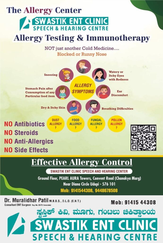 ಉಡುಪಿಯ ಸ್ವಸ್ತಿಕ್ ಕಿವಿ, ಮೂಗು, ಗಂಟಲು ಚಿಕಿತ್ಸಾಲಯದಲ್ಲಿ ವಿವಿಧ ರೀತಿಯ ಅಲರ್ಜಿ ಸಮಸ್ಯೆಗಳಿಗೆ ಸಿಗುತ್ತೆ ಅತ್ಯುತ್ತಮ ಪರಿಹಾರ