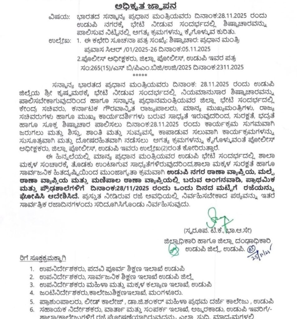 ಪ್ರಧಾನಿ ಮೋದಿ ಭೇಟಿ ಹಿನ್ನೆಲೆ: ನ.28ರಂದು ಅಂಗನವಾಡಿ, ಪ್ರಾಥಮಿಕ, ಪ್ರೌಢಶಾಲೆಗಳಿಗೆ ರಜೆ ಘೋಷಣೆ