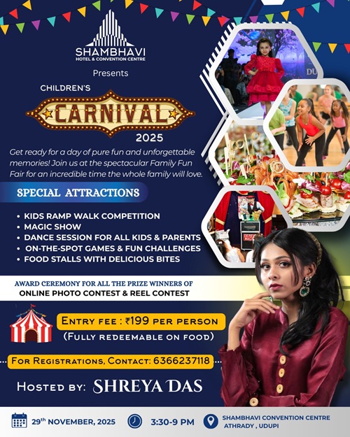 ಉಡುಪಿ: ಆತ್ರಾಡಿಯ ‘ಶಾಂಭವಿ ಹೋಟೆಲ್ & ಕನ್ವೆನ್ಶನ್ ಸೆಂಟರ್’ನಲ್ಲಿ ನ. 29 ರಂದು “ಮಕ್ಕಳ ಕಾರ್ನಿವಲ್”, ಕುಟುಂಬದ ಜೊತೆಗೆ ಬನ್ನಿ ಎಂಜಾಯ್ ಮಾಡಿ.!