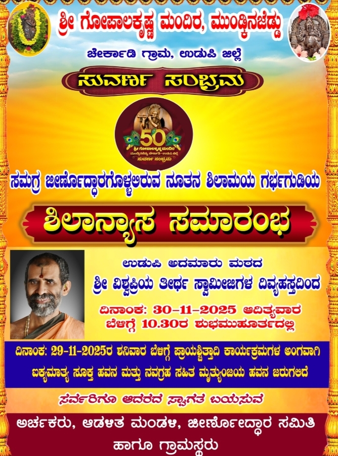 ಉಡುಪಿ:ನ.30 ರಂದು ಶ್ರೀ ಗೋಪಾಲಕೃಷ್ಣ ಮಂದಿರ, ಮುಂಡ್ಕಿನಜೆಡ್ಡುವಿನಲ್ಲಿ ಶಿಲಾನ್ಯಾಸ ಸಮಾರಂಭ