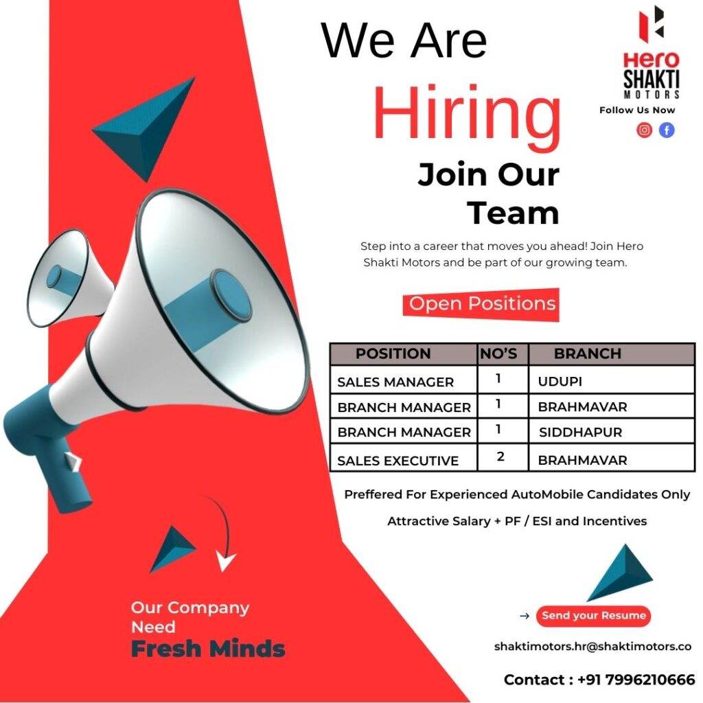 ಉಡುಪಿ:ಹೀರೋಶಕ್ತಿ ಮೋಟರ್ಸ್ನಲ್ಲಿ ವಿವಿಧ ಹುದ್ದೆಗಳಿಗೆ ನೇಮಕಾತಿ
