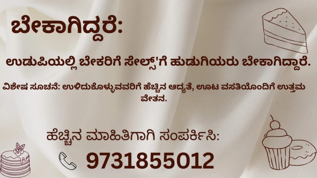 ಉಡುಪಿ: ಬೇಕರಿಗೆ ಸೇಲ್ಸ್’ಗೆ ಹುಡುಗಿಯರು ಬೇಕಾಗಿದ್ದಾರೆ.