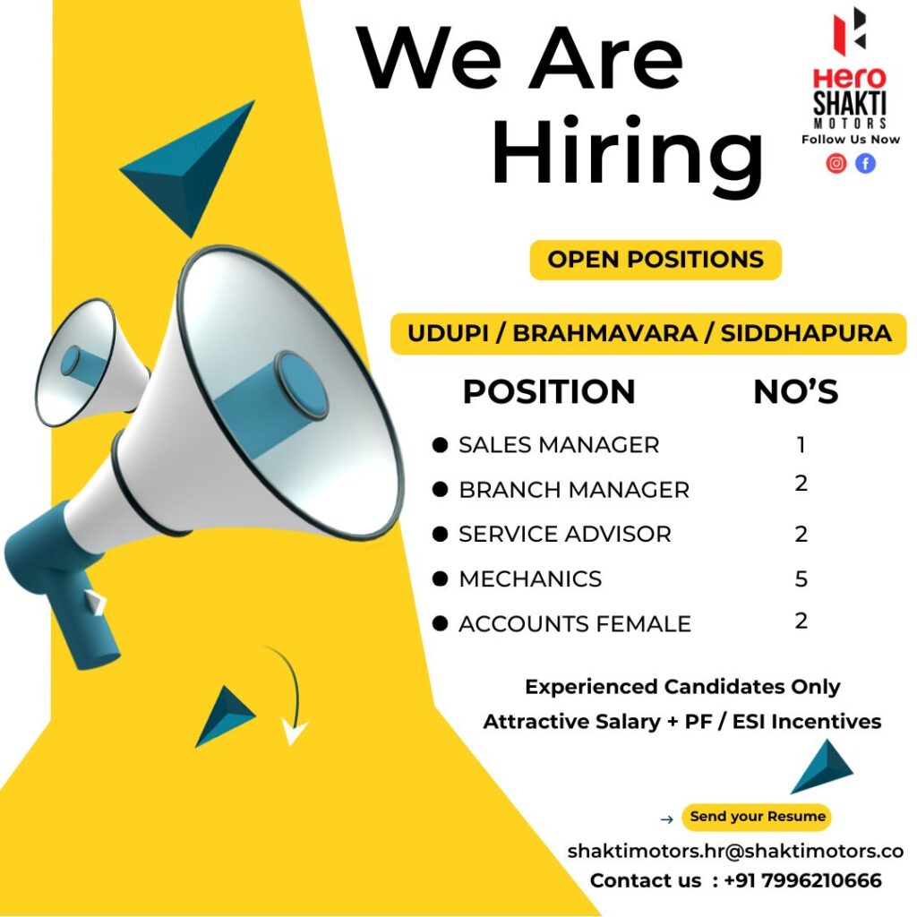 ಉಡುಪಿ,ಬ್ರಹ್ಮಾವರ,ಸಿದ್ಧಾಪುರದ ಹೀರೋ ಶಕ್ತಿ ಮೋಟಾರ್ಸ್ ನಲ್ಲಿ ವಿವಿಧ ಹುದ್ದೆಗಳಿಗೆ ನೇಮಕಾತಿ
