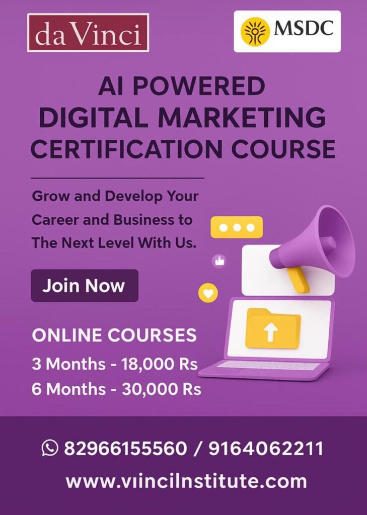 ಮಣಿಪಾಲ: ಮಣಿಪಾಲ: ಮಣಿಪಾಲ್ ಸ್ಕಿಲ್ ಡೆವಲಪ್ಮೆಂಟ್ ಸೆಂಟರ್ (TMA Pai Foundationನ ಘಟಕ) MSDCಯಲ್ಲಿಡಾ ವಿನ್ಚಿ ಸಹಯೋಗದಲ್ಲಿ ಎಐ ಆಧಾರಿತಡಿಜಿಟಲ್ ಮಾರ್ಕೆಟಿಂಗ್ ಪ್ರಮಾಣಪತ್ರ ಕೋರ್ಸ್ ನ್ನು MSDC ಪರಿಚಯಿಸಿದೆ. ನಿಮ್ಮ ವೃತ್ತಿಜೀವನ ಮತ್ತು ವ್ಯವಹಾರವನ್ನು ಎಐ ಮೂಲಕ ಇನ್ನಷ್ಟು ಬಲಿಷ್ಠಗೊಳಿಸಲು ಇದೊಂದು ಸದವಕಾಶವಾಗಿದೆ. ಆನ್ಲೈನ್ ಕೋರ್ಸ್ಗಳು 3 ತಿಂಗಳು – ರೂ. 18,0006 ತಿಂಗಳು – ರೂ. 30,000 ಗೆ ಲಭ್ಯವಿದ್ದು.ಈ ಒಳ್ಳೆಯ ಅವಕಾಶವನ್ನು ಮಿಸ್ ಮಾಡಿಕೊಳ್ಳದಿರಿ.ಸಂಪರ್ಕಿಸಿ: 8296615560 / 9164062211www.viincilinstitute.com
