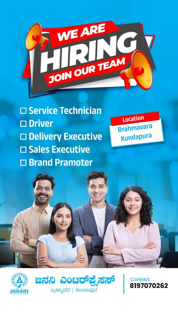 ಬ್ರಹ್ಮಾವರ ಹಾಗೂ ಕುಂದಾಪುರದ ಜನನಿ ಎಂಟರ್ಪ್ರೈಸಸ್ ನಲ್ಲಿ ವಿವಿಧ ಹುದ್ದೆಗಳಿಗೆ ನೇಮಕಾತಿ