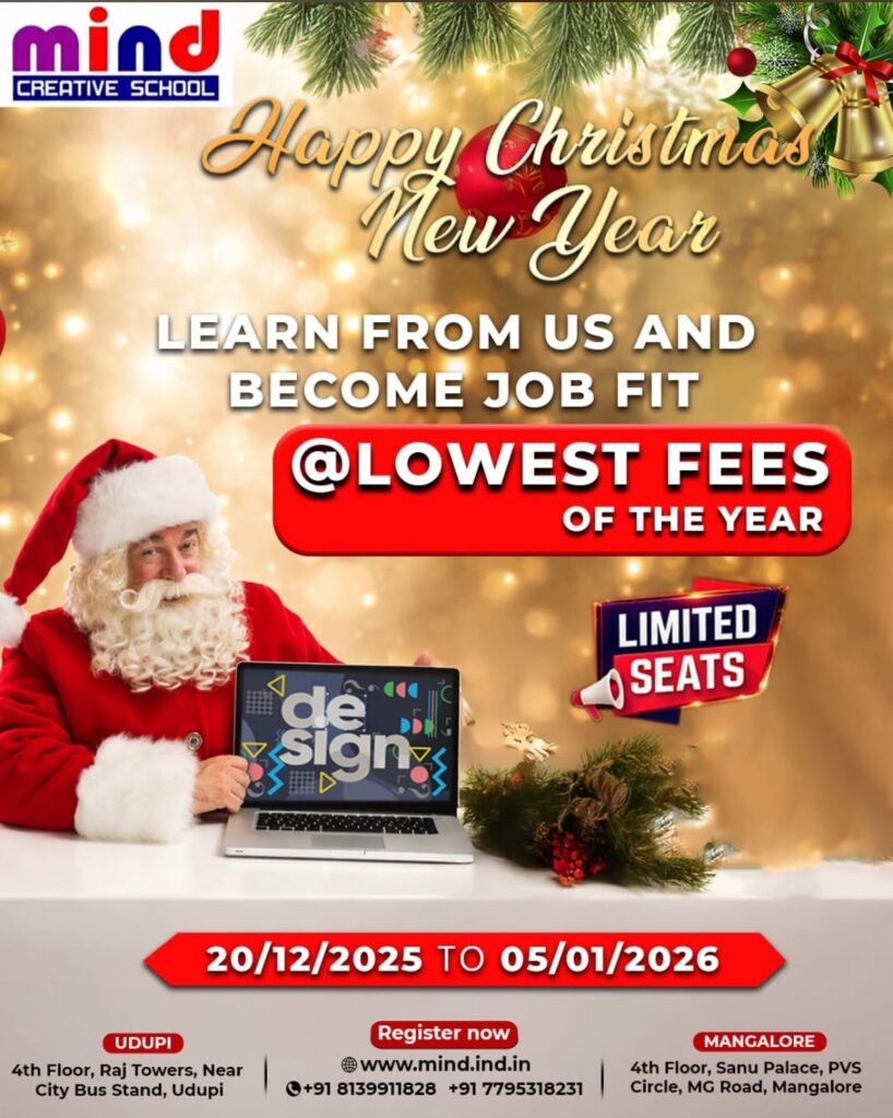 ಉಡುಪಿ:ಕ್ರಿಸ್ಮಸ್ ಹಾಗೂ ಹೊಸ ವರ್ಷದ ಪ್ರಯುಕ್ತ ಮೈಂಡ್ ಕ್ರಿಯೇಟಿವ್ ಸ್ಕೂಲ್ ನಲ್ಲಿ ಡಿ.20 ರಿಂದ ಜ.1 ರವರೆಗೆ ದಾಖಲಾತಿ ಆರಂಭವಾಗಲಿದೆ. ಸಂಪರ್ಕಿಸಿ:ಉಡುಪಿ4ನೇ ಮಹಡಿ, ರಾಜ್ ಟವರ್ಸ್, ಸಿಟಿ ಬಸ್ ನಿಲ್ದಾಣದ ಹತ್ತಿರ, ಉಡುಪಿ. ಈಗಲೇ ನೋಂದಾಯಿಸಿ:www.mind.ind.in+91 8139911828+91 7795318231 ಮಂಗಳೂರು4ನೇ ಮಹಡಿ, ಸಾನು ಪ್ಯಾಲೆಸ್, ಪಿವಿಎಸ್ ಸರ್ಕಲ್, ಎಂಜಿ ರಸ್ತೆ, ಮಂಗಳೂರು.