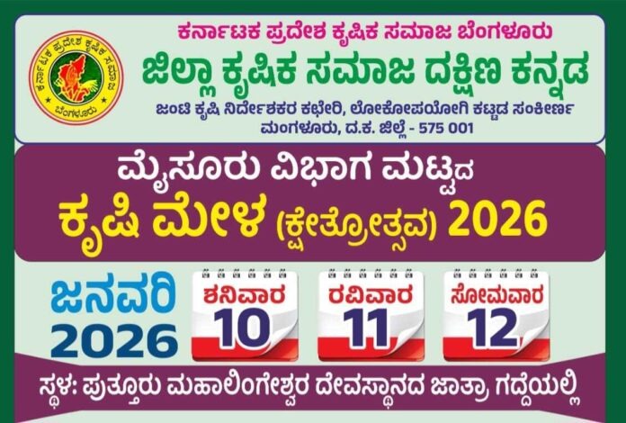 ಜ.10 – 12: ಪುತ್ತೂರಿನಲ್ಲಿ ಮೈಸೂರು ವಿಭಾಗ ಮಟ್ಟದ ಕೃಷಿ ಮೇಳ.