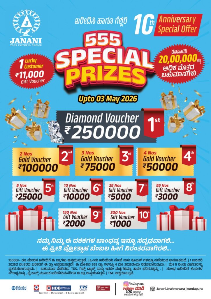 ಉಡುಪಿ:ಜನನಿ ಎಂಟರ್ಪ್ರೈಸಸ್ ತನ್ನ 10ನೇ ವಾರ್ಷಿಕೋತ್ಸವದ ಅಂಗವಾಗಿ ಭರ್ಜರಿ ಆಫರ್ಗಳನ್ನು ಘೋಷಿಸಿದೆ. ಮೇ 3, 2026ರವರೆಗೆ ಖರೀದಿ ಮಾಡುವ ಗ್ರಾಹಕರಿಗೆ 555 ವಿಶೇಷ ಬಹುಮಾನಗಳು ಹಾಗೂ ರೂ.20,00,000 ಕ್ಕೂ ಅಧಿಕ ಮೊತ್ತದ ಬಹುಮಾನಗಳು ಲಭ್ಯವಿದೆ. ಮೊದಲ ಬಹುಮಾನವಾಗಿ ರೂ. 2,50,000 ಮೌಲ್ಯದ ಡೈಮಂಡ್ ವೋಚರ್, ಎರಡನೇಯಿಂದ ನಾಲ್ಕನೇ ಸ್ಥಾನಗಳಿಗೆ ರೂ. 1,00,000, ₹75,000 ಮತ್ತು ₹50,000 ಮೌಲ್ಯದ ಗೋಲ್ಡ್ ವೋಚರ್ಗಳು ಲಭ್ಯ. ಜೊತೆಗೆ ವಿವಿಧ ಸ್ಥಾನಗಳಿಗೆ ₹25,000, ₹10,000, ₹5,000, ₹3,000, ₹2,000 ಮತ್ತು ₹1,000 ಮೌಲ್ಯದ […]