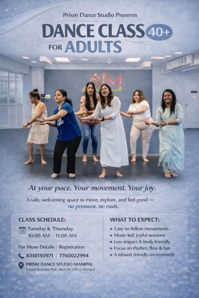 ಉಡುಪಿ:ಮಣಿಪಾಲದ ಪ್ರಿಸಮ್ ಡ್ಯಾನ್ಸ್ ಸ್ಟುಡಿಯೋ ಈಗ 40 ವರ್ಷ ಮೇಲ್ಪಟ್ಟ ವಯಸ್ಕರಿಗಾಗಿ ವಿಶೇಷ ನೃತ್ಯ ತರಗತಿಗಳನ್ನು ಆರಂಭಿಸಿದೆ.ಒತ್ತಡವಿಲ್ಲದೆ, ಸಂತೋಷ ಪಡೆಯಲು ಇದು ಸುರಕ್ಷಿತ ಮತ್ತು ಆತ್ಮೀಯ ವಾತಾವರಣವನ್ನು ಒದಗಿಸುತ್ತದೆ ಎಂದು ಆಯೋಜಕರು ತಿಳಿಸಿದ್ದಾರೆ. ಈ ತರಗತಿಗಳು ವಾರದಲ್ಲಿ ಮಂಗಳವಾರ ಮತ್ತು ಗುರುವಾರ ಬೆಳಗ್ಗೆ 10.00ರಿಂದ 11.00 ಗಂಟೆಯವರೆಗೆ ನಡೆಯಲಿದ್ದು, ಸರಳ ಚಲನಗಳು, ಸಂಗೀತದೊಂದಿಗೆ ಆನಂದಕರ ಸೆಷನ್ಗಳು ಹಾಗೂ ದೇಹಕ್ಕೆ ಸ್ನೇಹಿ, ಕಡಿಮೆ ಪರಿಣಾಮದ ವ್ಯಾಯಾಮಗಳನ್ನು ಒಳಗೊಂಡಿರುತ್ತವೆ. ರಿಜಿಸ್ಟ್ರೇಶನ್ ಮತ್ತು ಹೆಚ್ಚಿನ ಮಾಹಿತಿಗೆ ಸಂಪರ್ಕಿಸಿ: 8310150971 / 7760022994.ಪ್ರಿಸಮ್ […]