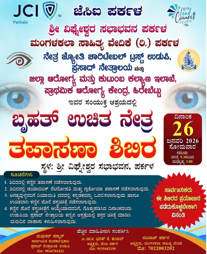 ಪರ್ಕಳ:ಶ್ರೀ ವಿಘ್ನೇಶ್ವರ ಸಭಾಭವನ ಪರ್ಕಳ, ಮಂಗಳಕಲಾ ಸಾಹಿತ್ಯ ವೇದಿಕೆ (ರಿ.) ಪರ್ಕಳ, ನೇತ್ರ ಜ್ಯೋತಿ ಚಾರಿಟೇಬಲ್ ಟ್ರಸ್ಟ್ ಉಡುಪಿ, ಪ್ರಸಾದ್ ನೇತ್ರಾಲಯ ಹಾಗೂ ಜಿಲ್ಲಾ ಆರೋಗ್ಯ ಮತ್ತು ಕುಟುಂಬ ಕಲ್ಯಾಣ ಇಲಾಖೆ, ಪ್ರಾಥಮಿಕ ಆರೋಗ್ಯ ಕೇಂದ್ರ ಹಿರೆಬೆಟ್ಟು ಇವರ ಸಂಯುಕ್ತ ಆಶ್ರಯದಲ್ಲಿ ಉಚಿತ ನೇತ್ರ ತಪಾಸಣಾ ಶಿಬಿರವನ್ನು ಆಯೋಜಿಸಲಾಗಿದೆ. ಈ ಶಿಬಿರವು ಜನವರಿ 26, 2026 (ಸೋಮವಾರ)ರಂದು ಬೆಳಿಗ್ಗೆ 9.30ರಿಂದ ಮಧ್ಯಾಹ್ನ 1.00ರವರೆಗೆ ಪರ್ಕಳದ ಶ್ರೀ ವಿಘ್ನೇಶ್ವರ ಸಭಾಭವನದಲ್ಲಿ ನಡೆಯಲಿದೆ. ಶಿಬಿರದ ಪ್ರಮುಖ ಸೌಲಭ್ಯಗಳು :◾ಕಣ್ಣಿನ ಉಚಿತ […]
