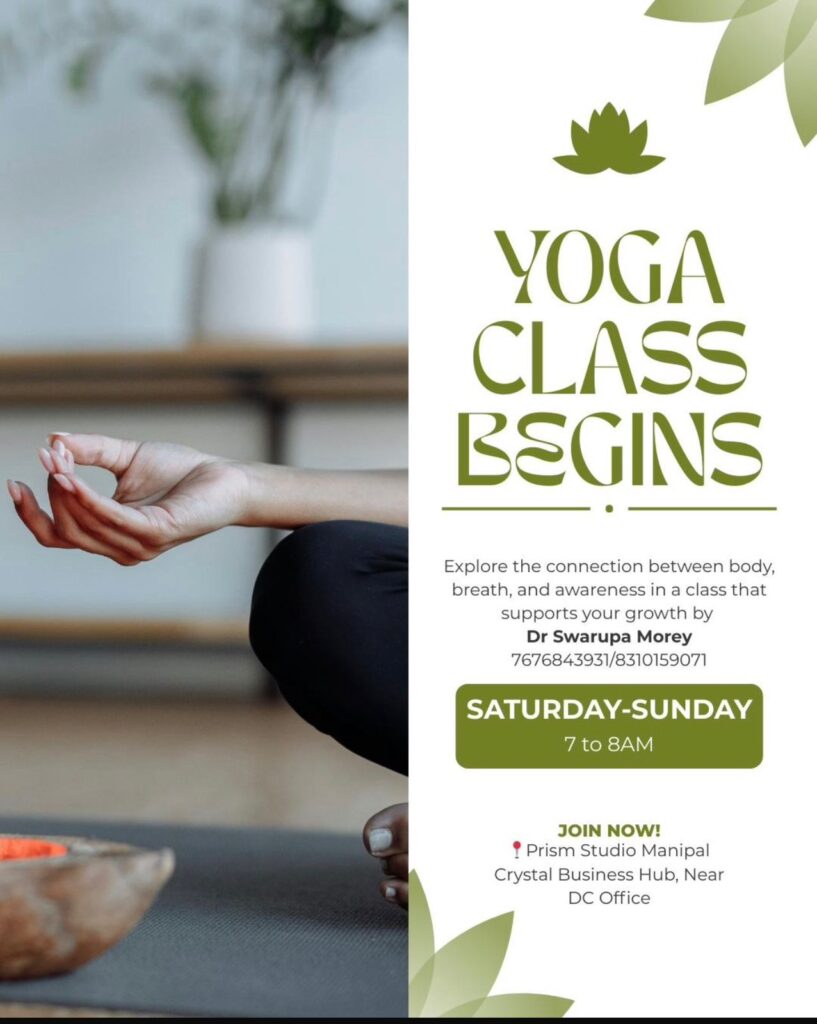ಉಡುಪಿ:ಮಣಿಪಾಲದ ಪ್ರಿಸಂ ಸ್ಟುಡಿಯೋ (ಕ್ರಿಸ್ಟಲ್ ಬಿಸಿನೆಸ್ ಹಬ್, ಡಿಸಿ ಆಫೀಸ್ ಸಮೀಪ) ನಲ್ಲಿ ವಾರಾಂತ್ಯ ಯೋಗ ಕ್ಲಾಸ್ಗಳು ಶೀಘ್ರದಲ್ಲೇ ಆರಂಭಗೊಳ್ಳಲಿವೆ. ದೇಹ–ಉಸಿರಾಟ–ಜಾಗೃತಿಯ ಸಮನ್ವಯದ ಮೂಲಕ ವ್ಯಕ್ತಿತ್ವ ವಿಕಾಸಕ್ಕೆ ನೆರವಾಗುವ ಈ ತರಗತಿಗಳನ್ನು ಡಾ. ಸ್ವರೂಪಾ ಮೊರೆ ನಡೆಸಲಿದ್ದಾರೆ. ಶನಿವಾರ ಮತ್ತು ಭಾನುವಾರ ಬೆಳಗ್ಗೆ 7 ರಿಂದ 8 ಗಂಟೆಯವರೆಗೆ ತರಗತಿಗಳು ನಡೆಯಲಿದ್ದು, ನೋಂದಣಿಗಾಗಿ ಸಂಪರ್ಕಿಸಿ:📞 7676843931 / 8310159071