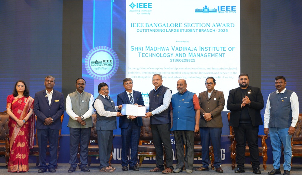 ಉಡುಪಿ,ಬಂಟಕಲ್: ಬಂಟಕಲ್ನ ಶ್ರೀ ಮಧ್ವ ವಾದಿರಾಜ ತಾಂತ್ರಿಕ ಮಹಾವಿದ್ಯಾಲಯದ ಐಇಇಇ ವಿದ್ಯಾರ್ಥಿ ಶಾಖೆಗೆ ಪ್ರತಿಷ್ಠಿತ ಐದು ಪ್ರಶಸ್ತಿ ದೊರೆತಿದೆ. ಈ ಪ್ರಶಸ್ತಿಯನ್ನು ದಿನಾಂಕ 18 ಜನವರಿ 2026ರ ರಂದು ಬೆಂಗಳೂರಿನಲ್ಲಿ ನಡೆದ ಐಇಇಇ ಬೆಂಗಳೂರು ಸೆಕ್ಷನ್ನ ವಾರ್ಷಿಕ ಸಭೆಯಲ್ಲಿ ನೀಡಲಾಯಿತು. ಐಇಇಇ ವಿದ್ಯಾರ್ಥಿ ಶಾಖೆಯು ಪಡೆದುಕೊಂಡ ಪ್ರಶಸ್ತಿಗಳು “ಔಟ್ ಸ್ಟ್ಯಾಂಡಿಂಗ್ ಲಾರ್ಜ್ ಸ್ಟುಡೆಂಟ್ ಬ್ರಾಂಚ್ ಅವಾರ್ಡ್”, ಬೆಂಗಳೂರು ಸೆಕ್ಷನ್ನ “ಟಾಪ್ 25 ವಿದ್ಯಾರ್ಥಿ ಶಾಖೆಗಳ ಪಟ್ಟಿಯಲ್ಲಿ ಸ್ಥಾನ”, “ಮೆಂಬರ್ ಶಿಪ್ ಡೆವಲಪ್ಮೆಂಟ್ ಚಾಲೆಂಜ್ ಅವಾರ್ಡ್”, “ಔಟ್ ಸ್ಟ್ಯಾಂಡಿಂಗ್ […]