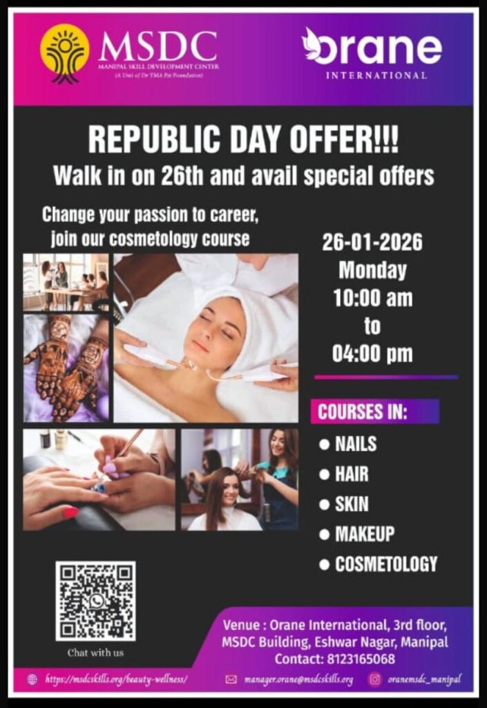 ಮಣಿಪಾಲ: (MSDC) ಮಣಿಪಾಲ ಕೌಶಲ್ಯ ಅಭಿವೃದ್ಧಿ ಕೇಂದ್ರ ಓರೇನ್ ಇಂಟರ್ನ್ಯಾಷನಲ್’ನಲ್ಲಿ ಗಣರಾಜ್ಯೋತ್ಸವದ ಪ್ರಯುಕ್ತ ಜ.26 ರಿಂದ ಜ.30 ರ ವರೆಗೆ ಉಗುರುಗಳು, ಕೂದಲು, ಚರ್ಮ, ಮೇಕ್ಅಪ್ ಹಾಗೂ ಕಾಸ್ಮೆಟಾಲಜಿ’ಗೆ ವೀಶೆಷ ಕೊಡುಗೆಯನ್ನು ಆಯೋಜಿಸಿದೆ. ಜ.26 ರಿಂದ ಭೇಟಿ ನೀಡಿ ಮತ್ತು ವಿಶೇಷ ಕೊಡುಗೆಗಳನ್ನು ಪಡೆಯಿರಿ. ನಿಮ್ಮ ಉತ್ಸಾಹವನ್ನು ವೃತ್ತಿಜೀವನಕ್ಕೆ ಬದಲಾಯಿಸಿ, ನಮ್ಮ ಕಾಸ್ಮೆಟಾಲಜಿ ಕೋರ್ಸ್ಗೆ ಸೇರಿಕೊಳ್ಳಬಹುದು. ಬೆಳಿಗ್ಗೆ 10:00 ರಿಂದ ಸಂಜೆ 04:00 ರವರೆಗೆ. ಕೋರ್ಸ್ಗಳು: ಹೆಚ್ಚಿನ ಮಾಹಿತಿಗಾಗಿ ಸಂಪರ್ಕಿಸಿ:ಸ್ಥಳ: ಓರೇನ್ ಇಂಟರ್ನ್ಯಾಷನಲ್, 3 ನೇ ಮಹಡಿ, […]