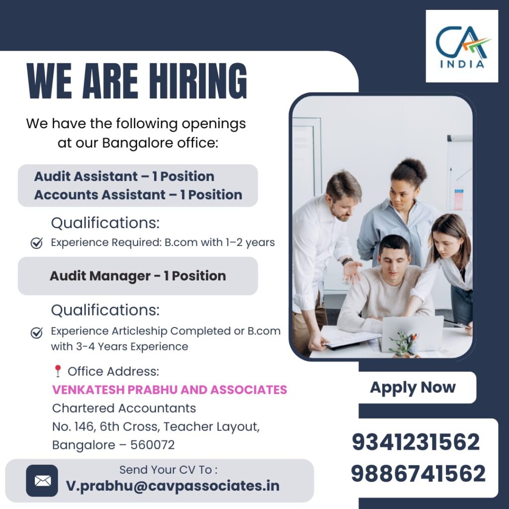 ಬೆಂಗಳೂರಲ್ಲಿರುವ ವೆಂಕಟೇಶ್ ಪ್ರಭು ಅಂಡ್ ಅಸೋಸಿಯೇಟ್ಸ್ (Chartered Accountants) ಸಂಸ್ಥೆಯಲ್ಲಿ ಅರ್ಹ ಅಭ್ಯರ್ಥಿಗಳಿಗಾಗಿ ಉದ್ಯೋಗಾವಕಾಶಗಳು ಲಭ್ಯವಿವೆ. ಹುದ್ದೆಗಳು: 🔹ಆಡಿಟ್ ಅಸಿಸ್ಟೆಂಟ್ – 1 ಸ್ಥಾನ🔹ಅಕೌಂಟ್ಸ್ ಅಸಿಸ್ಟೆಂಟ್ – 1 ಸ್ಥಾನ🔹ಆಡಿಟ್ ಮ್ಯಾನೇಜರ್ – 1 ಸ್ಥಾನ ಅರ್ಹತೆ:▪ಆಡಿಟ್ / ಅಕೌಂಟ್ಸ್ ಅಸಿಸ್ಟೆಂಟ್: B.Com ಹಾಗೂ 1–2 ವರ್ಷದ ಅನುಭವ ಇರಬೇಕು. ▪ಆಡಿಟ್ ಮ್ಯಾನೇಜರ್: Articleship ಪೂರ್ಣಗೊಳಿಸಿರಬೇಕು. ಅಥವಾ B.Com ಜೊತೆಗೆ 3–4 ವರ್ಷದ ಅನುಭವವಿರಬೇಕು. 📍 ಕಚೇರಿ ವಿಳಾಸ:ವೆಂಕಟೇಶ್ ಪ್ರಭು ಅಂಡ್ ಅಸೋಸಿಯೇಟ್ಸ್,ಚಾರ್ಟರ್ಡ್ ಅಕೌಂಟೆಂಟ್ಸ್,ನಂ.146, 6ನೇ ಕ್ರಾಸ್, […]