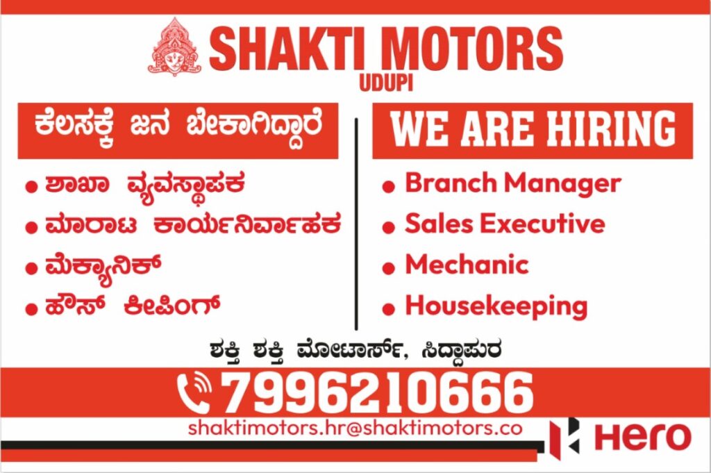 ಉಡುಪಿ:ಶಕ್ತಿ ಮೋಟಾರ್ಸ್ ನಲ್ಲಿ ವಿವಿಧ ಹುದ್ದೆಗಳಿಗೆ ನೇಮಕಾತಿ