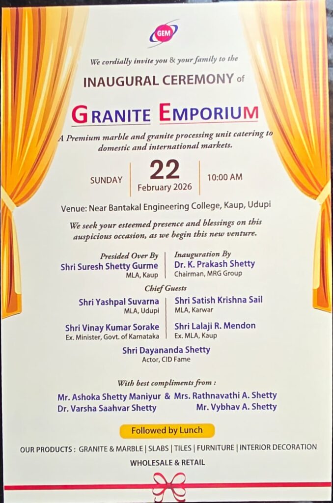 ಉಡುಪಿ: ಕಾಪು ಸಮೀಪದ ಬಂಟಕಲ್ ಎಂಜಿನಿಯರಿಂಗ್ ಕಾಲೇಜ್ ಹತ್ತಿರ ಹೊಸದಾಗಿ ಕಾರ್ಯನಿರ್ವಹಿಸಲು ಸಿದ್ಧಗೊಂಡ “ಗ್ರಾನೈಟ್ ಎಂಪೋರಿಯಂ” ಘಟಕದ ಉದ್ಘಾಟನಾ ಸಮಾರಂಭವು ಫೆ. 22 ರಂದು ಭಾನುವಾರ ಬೆಳಿಗ್ಗೆ 10 ಗಂಟೆಗೆ ನಡೆಯಲಿದೆ. ಈ ಘಟಕವು ದೇಶೀಯ ಹಾಗೂ ಅಂತರರಾಷ್ಟ್ರೀಯ ಮಾರುಕಟ್ಟೆಗಳಿಗೆ ಪೂರೈಸುವ ಪ್ರೀಮಿಯಂ ಮಾರ್ಬಲ್ ಮತ್ತು ಗ್ರಾನೈಟ್ ಪ್ರೊಸೆಸಿಂಗ್ ಯುನಿಟ್ ಆಗಿದೆ. ಸಮಾರಂಭದಲ್ಲಿ ಕಾಪು ಕ್ಷೇತ್ರದ ಶಾಸಕರಾದ ಸುರೇಶ್ ಶೆಟ್ಟಿ ಗುರ್ಮೆ ಅಧ್ಯಕ್ಷತೆ ವಹಿಸಲಿದ್ದಾರೆ. ಎಂಆರ್ಜಿ ಗ್ರೂಪ್ ಅಧ್ಯಕ್ಷರಾದ ಡಾ. ಕೆ. ಪ್ರಕಾಶ್ ಶೆಟ್ಟಿ ಅವರು ಘಟಕವನ್ನು […]