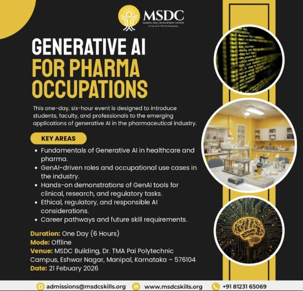 ಮಣಿಪಾಲ: ಮಣಿಪಾಲ್ ಸ್ಕಿಲ್ ಡೆವಲಪ್ಮೆಂಟ್ ಸೆಂಟರ್ (MSDC) ವತಿಯಿಂದ “ಫಾರ್ಮಾ ವೃತ್ತಿಪರರಿಗೆ ಜನರೇಟಿವ್ ಎಐ” ವಿಷಯದ ಮೇಲೆ ಒಂದು ದಿನದ ವಿಶೇಷ ಕಾರ್ಯಾಗಾರವನ್ನು ಫೆ. 21 ರಂದು ಆಯೋಜಿಸಲಾಗಿದೆ. ಆರು ಗಂಟೆಗಳ ಈ ಕಾರ್ಯಕ್ರಮವು ವಿದ್ಯಾರ್ಥಿಗಳು, ಅಧ್ಯಾಪಕರು ಹಾಗೂ ವೃತ್ತಿಪರರಿಗೆ ಔಷಧೋದ್ಯಮದಲ್ಲಿ ಜನರೇಟಿವ್ ಎಐ ಅನ್ವಯಿಕೆಗಳ ಕುರಿತು ಪರಿಚಯ ಮತ್ತು ಪ್ರಾಯೋಗಿಕ ಅರಿವು ನೀಡುವ ಉದ್ದೇಶ ಹೊಂದಿದೆ. ಕಾರ್ಯಕ್ರಮದಲ್ಲಿ ಆರೋಗ್ಯ ಮತ್ತು ಫಾರ್ಮಾ ಕ್ಷೇತ್ರದಲ್ಲಿ ಜನರೇಟಿವ್ ಎಐಯ ಮೂಲಭೂತ ಅಂಶಗಳು, ಉದ್ಯಮದಲ್ಲಿನ GenAI ಆಧಾರಿತ ಉದ್ಯೋಗಾವಕಾಶಗಳು ಹಾಗೂ […]