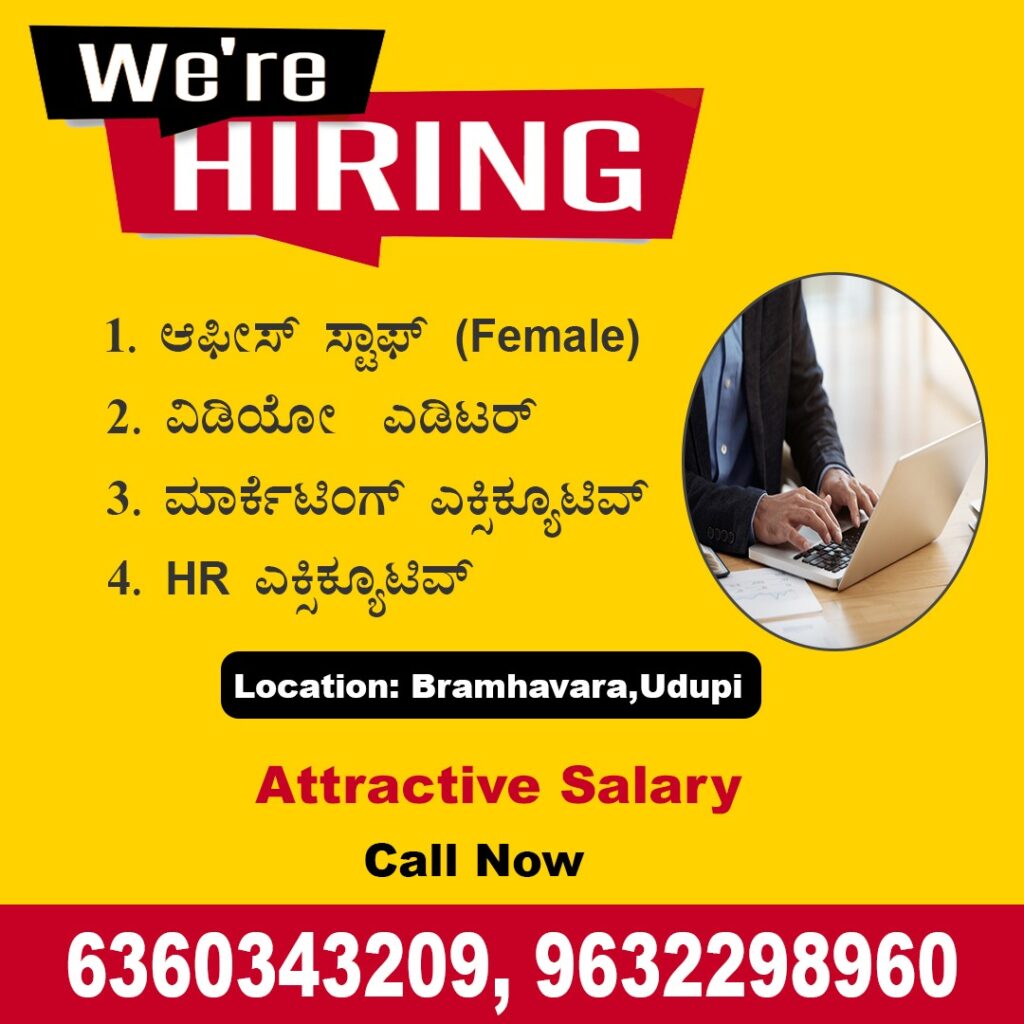 ಉಡುಪಿ:ಉಡುಪಿ ಜಿಲ್ಲೆಯ ಬ್ರಹ್ಮಾವರದಲ್ಲಿ ವಿವಿಧ ಹುದ್ದೆಗಳಿಗೆ ನೇಮಕಾತಿ ನಡೆಯಲಿದೆ. ಆಸಕ್ತ ಅಭ್ಯರ್ಥಿಗಳಿಂದ ಅರ್ಜಿಗಳನ್ನು ಆಹ್ವಾನಿಸಲಾಗಿದೆ. ಲಭ್ಯವಿರುವ ಹುದ್ದೆಗಳು: 🔹ಆಫೀಸ್ ಸ್ಟಾಫ್ (ಮಹಿಳೆ) 🔹ವಿಡಿಯೋ ಎಡಿಟರ್ 🔹ಮಾರ್ಕೆಟಿಂಗ್ ಎಕ್ಸಿಕ್ಯೂಟಿವ್ 🔹HR ಎಕ್ಸಿಕ್ಯೂಟಿವ್ ಆಯ್ಕೆಯಾದ ಅಭ್ಯರ್ಥಿಗಳಿಗೆ ಆಕರ್ಷಕ ವೇತನ ನೀಡಲಾಗುತ್ತದೆ. ಸ್ಥಳ: ಬ್ರಹ್ಮಾವರ, ಉಡುಪಿ. ಹೆಚ್ಚಿನ ಮಾಹಿತಿಗಾಗಿ ಕರೆಮಾಡಿ:📞6360343209, 📞9632298960