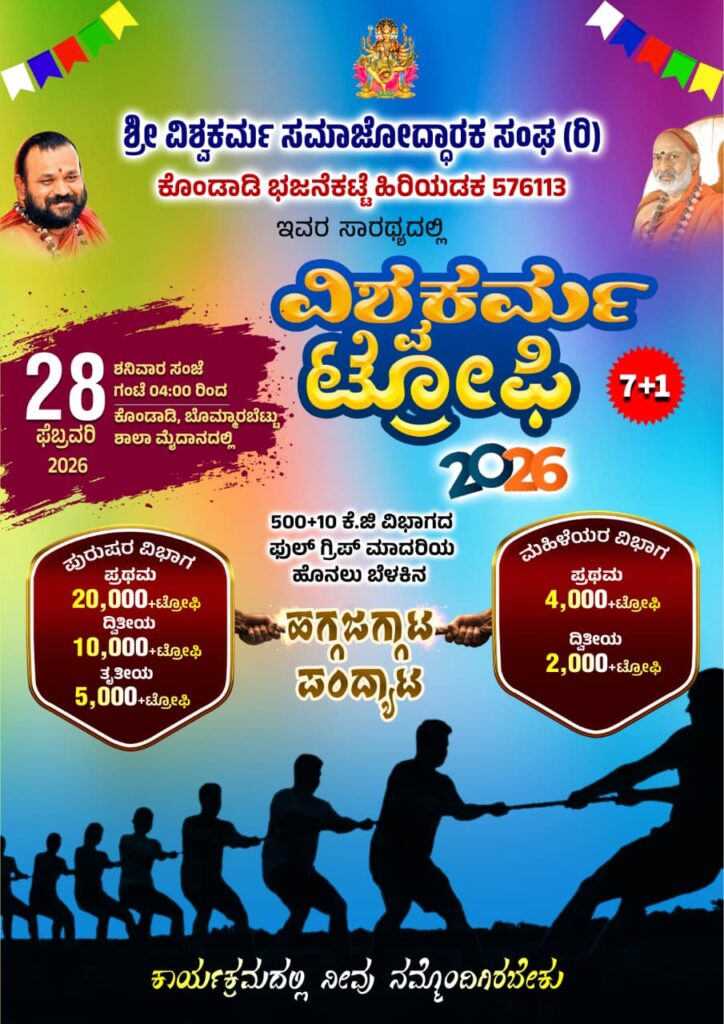 ಹಿರಿಯಡಕ: ಶ್ರೀ ವಿಶ್ವಕರ್ಮ ಸಮಾಜೋದ್ಧಾರಕ ಸಂಘ (ರಿ). ಕೊಂಡಾಡಿ ಭಜನೆಕಟ್ಟೆ ಹಿರಿಯಡಕ ಇವರ ಸಾರಥ್ಯದಲ್ಲಿ ವಿಶ್ವಕರ್ಮ ಟ್ರೋಫಿ 2026 ಫೆಬ್ರವರಿ 28 ಶನಿವಾರದಂದು ಹೊನಲು ಬೆಳಕಿನ ಪುರುಷರ ವಿಭಾಗದ 500+10 ಕೆ ಜಿ ಗ್ರಿಪ್ ಮಾದರಿಯ ಹಾಗೂ ಆಹ್ವಾನಿತ ಮಹಿಳಾ ವಿಭಾಗದ ಹಗ್ಗಜಗ್ಗಾಟ ಪಂದ್ಯಾಟವು ಕೊಂಡಾಡಿ ಬೊಮ್ಮರಬೆಟ್ಟು ಶಾಲಾ ಮೈದಾನದಲ್ಲಿ ನಡೆಯಲಿದೆ.ಹೆಚ್ಚಿನ ಮಾಹಿತಿಗಾಗಿ 9481978881