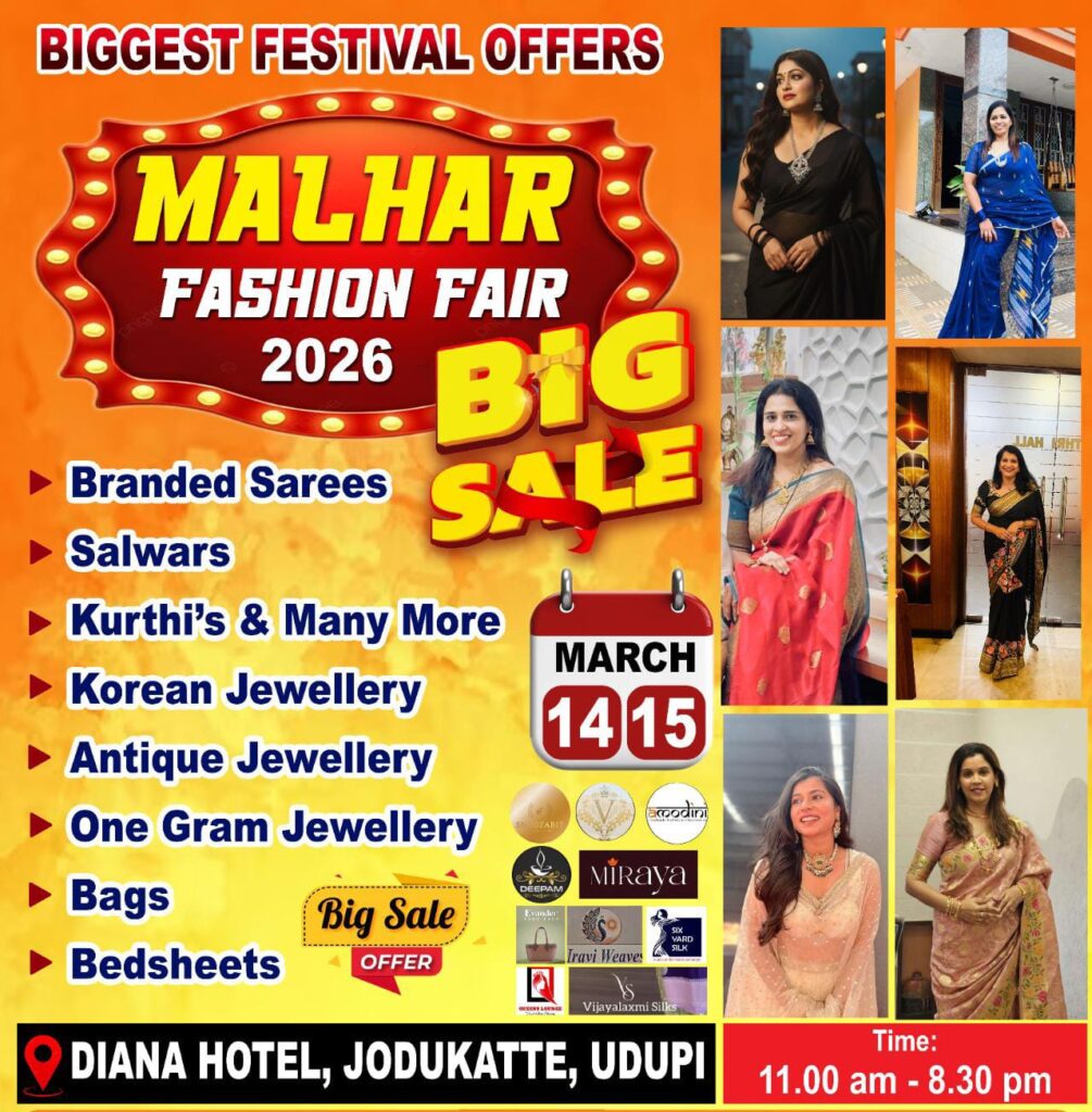 ಉಡುಪಿ: ಉಡುಪಿಯ ಜೋಡುಕಟ್ಟೆಯ ಡಯಾನಾ ಹೋಟೆಲ್ನಲ್ಲಿ ಮಾರ್ಚ್ 14 ಮತ್ತು 15 ರಂದು “ಮಲ್ಹಾರ್ ಫ್ಯಾಷನ್ ಫೇರ್ 2026” ಎಂಬ ಹೆಸರಿನಲ್ಲಿ ಭರ್ಜರಿ ಫ್ಯಾಷನ್ ಮೇಳ ಆಯೋಜಿಸಲಾಗಿದೆ. ಈ ಫ್ಯಾಷನ್ ಮೇಳದಲ್ಲಿ ವಿವಿಧ ಬ್ರಾಂಡೆಡ್ ಸೀರೆಗಳು, ಸಲ್ವಾರ್ಗಳು, ಕುರ್ಥಿಗಳು ಸೇರಿದಂತೆ ಹಲವಾರು ಹೊಸ ಫ್ಯಾಷನ್ ಉಡುಪುಗಳು ಮಾರಾಟಕ್ಕೆ ಲಭ್ಯವಿರುತ್ತವೆ. ಜೊತೆಗೆ ಕೊರಿಯನ್ ಜುವೆಲ್ಲರಿ, ಆಂಟಿಕ್ ಜುವೆಲ್ಲರಿ, ಒನ್ ಗ್ರಾಮ್ ಜುವೆಲ್ಲರಿ, ಬ್ಯಾಗ್ಗಳು ಮತ್ತು ಬೆಡ್ಶೀಟ್ಗಳು ಸಹ ವಿಶೇಷ ರಿಯಾಯಿತಿಯಲ್ಲಿ ದೊರೆಯಲಿವೆ. ಮಾರ್ಚ್ 14 ಮತ್ತು 15ರಂದು ಬೆಳಗ್ಗೆ […]