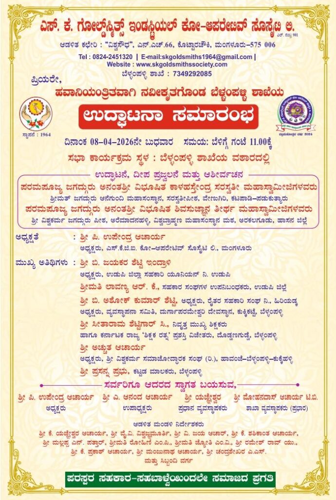 ಎಸ್.ಕೆ. ಗೋಲ್ಡ್ ಸ್ಮಿತ್ಸ್ ಇಂಡಸ್ಟ್ರಿಯಲ್ ಕೋ ಆಪರೇಟಿವ್ ಸೊಸೈಟಿ ಲಿ. ಇದರ ಬೆಳ್ಳಂಪಳ್ಳಿ ಶಾಖೆಯು ಹವಾನಿಯಂತ್ರಿತವಾಗಿ ನವೀಕೃತಗೊಂಡಿದ್ದು, ಉದ್ಘಾಟನಾ ಸಮಾರಂಭ ದಿ. 08-04-2026, ಬುಧವಾರ ದಂದು ಬೆಳಗ್ಗೆ 11 ಗಂಟೆಗೆ ನೆರವೇರಲಿದೆ. ಪರಮಪೂಜ್ಯ ಜಗದ್ಗುರು ಅನಂತ ಶ್ರೀ ವಿಭೂಷಿತ ಕಾಳಹಸ್ತೇಂದ್ರ ಸರಸ್ವತೀ ಮಹಾಸ್ವಾಮೀಜಿ, ಆನೆಗುಂದಿ ಮಹಾಸಂಸ್ಥಾನ ಹಾಗೂ ಪರಮಪೂಜ್ಯ ಜಗದ್ಗುರು ಅನಂತ ಶ್ರೀ ವಿಭೂಷಿತ ಶಿವ ಸುಜ್ಞಾನ ತೀರ್ಥ ಮಹಾಸ್ವಾಮೀಜಿಗಳವರು, ಶ್ರೀ ವಿಶ್ವಕರ್ಮ ಜಗದ್ಗುರು ಪೀಠ, ಅರೆಮಾದನಹಳ್ಳಿ ಇವರಿಂದ ಉದ್ಘಾಟನೆ, ದೀಪ ಪ್ರಜ್ವಲನೆ ಮತ್ತು ಆಶೀರ್ವಚನ ನೆರವೇರಲಿದೆ. […]