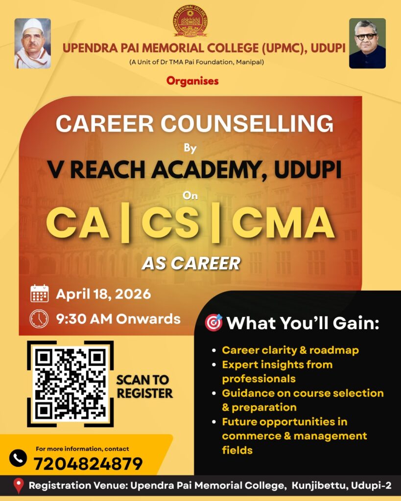 ಉಡುಪಿ: ಉಪೇಂದ್ರ ಪೈ ಮೆಮೊರಿಯಲ್ ಕಾಲೇಜು (ಯುಪಿಎಂಸಿ), ಉಡುಪಿ ವತಿಯಿಂದ ವಿದ್ಯಾರ್ಥಿಗಳಿಗೆ ವೃತ್ತಿ ಮಾರ್ಗದರ್ಶನ ಒದಗಿಸುವ ಉದ್ದೇಶದಿಂದ ವಿಶೇಷ “Career Counselling” ಕಾರ್ಯಕ್ರಮವನ್ನು ಏಪ್ರಿಲ್ 18 ರಂದು ಬೆಳಿಗ್ಗೆ 9:30ರಿಂದ ಉಡುಪಿ ಕುಂಜಿಬೆಟ್ಟು ಉಪೇಂದ್ರ ಪೈ ಮೆಮೊರಿಯಲ್ ಕಾಲೇಜು ಕ್ಯಾಂಪಸ್ನಲ್ಲಿ ಆಯೋಜಿಸಲಾಗಿದೆ. ಈ ಕಾರ್ಯಕ್ರಮವನ್ನು ವಿ ರೀಚ್ ಅಕಾಡೆಮೆ V Reach Academy, ಉಡುಪಿ ವತಿಯಿಂದ ನಡೆಸಲಾಗುತ್ತಿದ್ದು, Chartered Accountancy (CA), Company Secretary (CS) ಮತ್ತು Cost and Management Accounting (CMA) ಕ್ಷೇತ್ರಗಳಲ್ಲಿ ವೃತ್ತಿ […]